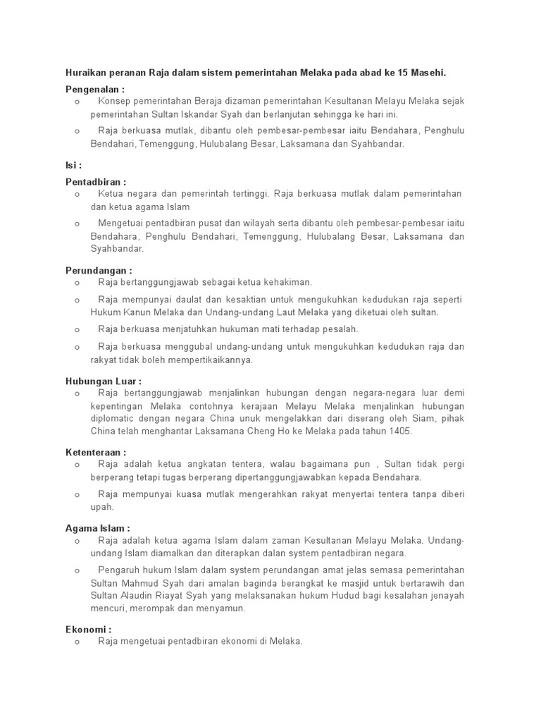 Huraikan Peranan Raja Dalam Sistem Pemerintahan Melaka Pada Abad Ke 15 Masehi Pdf